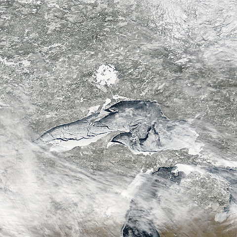 English: A relatively rare blanket of ice rested on the surface of Lake Superior in early March 2009. The Moderate Resolution Imaging Spectroradiometer (MODIS) on NASA’s Aqua satellite captured this image of the lake and its surroundings on March 3, 2009. In this true-color, photo-like image, ice floating on the surface of Lake Superior ranges in colour from white to pale gray-blue. The ice appears most solid along the southern shore of the western half of the lake. North of that solid band of ice, cracks reveal deep blue lake water. Dark lake water also appears in the eastern part of the lake, especially along its northern shore. As it does in the west, ice cover appears relatively unbroken at the extreme southeast end of the lake.