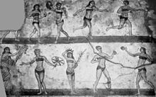 Famous "bikini girls" mosaic (found by archeological excavation of the ancient Roman villa near Piazza Armerina in Sicily), showing women exercising, running, or receiving the palm of victory and crown (for winning an athletic competition).