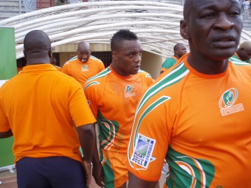 English: Côte d'Ivoire National Rugby Team at the Stade Felix Houphouet-Boigny run out before playing Zambia in the CAN qualifiers for the 2011 Rugby World Cup