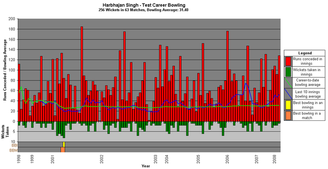 A graph that shows Harbhajan Singh's test career bowling statistics and how they have varied over time. It was created by Masai 162. This image was created using Microsoft Excel and MS Paint. Source Data obtained from www.howstat.com.au