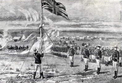 English: The Pioneer Column of the British South Africa Company reached the site of Fort Salisbury on 12 September 1890, which was celebrated from 1920 as Pioneers' Day. The next morning, at 10 am on 13 September 1890, a full dress parade of the column was held. The seven-pounder gun fired a royal salute and Canon Balfour said a prayer as the column's Lieutenant Edward Tyndale-Biscoe hoisted the flag atop the kopje overlooking the site of the future capital, Salisbury.