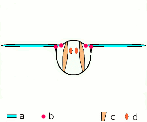 Schema eines dorsoventralen Schnittes durch ein Brustsegment mit Flügeln a Flügel b primäre und sekundäre Flügelgelenke c Dorso-ventrale Flugmuskulatur d Muskulatur parallel zur Körperlängsachse en: Basic motion of the insect wing in insect with an indirect flight mechanism Sheme of dorsoventral cut through a thorax segment with wings a wings b joints c nuclear organ d longitudinal muscles