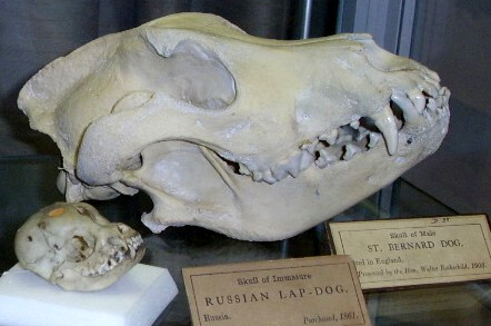 English: Author: Sarah Hartwell (Messybeast). Own work. Comparison of skull sizes - Russian Lapdog and St Bernard Dog. Rothschild Zoological Museum, Tring, England.