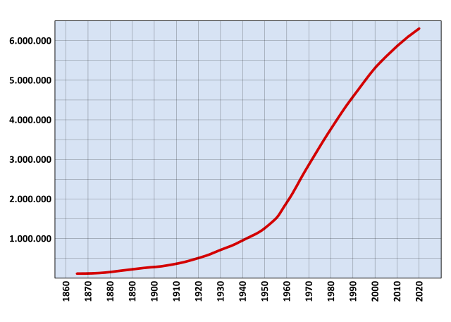 Español: Gráfico de población de la ciudad de Santiago de Chile, capital de Chile, entre 1860 y 2002 con proyección hasta 2020. Los datos están basados en los censos nacionales entre 1860 y 2002. Para 1992, fueron considerados los habitantes de Santiago propiamente tal más Puente Alto y San Bernardo según el Informe de Ciudades, Pueblos y Aldeas (1992). Para 2002, se tomó el número de habitantes del Informe de Ciudades, Pueblos y Aldeas (2002). Las proyecciones realizadas desde 2002 hasta 2010 están basadas en las proyecciones realizadas por el Instituto Nacional de Estadísticas. Para ello, se ha calculado la población de las comunas de la Provincia de Santiago, más Padre Hurtado (prov. de Talagante), Pirque, Puente Alto, San José de Maipo (prov. de Cordillera) y San Bernardo (prov. de Maipo); para eliminar la población de las comunas incluidas pero que no pertenecen al área metropolitana se ha tomado el 95,4% del total (porcentaje de la población de Santiago en 2002 con respecto a la población total proyectada para el mismo año).