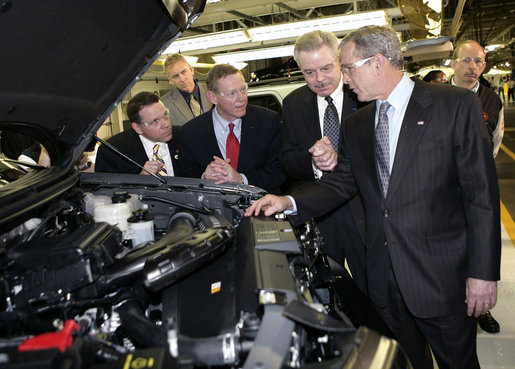 English: U.S. Rep. Sam Graves, Ford President Alan Mulally, Ford Group Vice President Derrick Kuzak, and President George W. Bush at the Ford Kansas City Assembly Plant in Claycomo, Missouri on March 20, 2007. White House photo by Eric Draper.