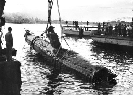 English: June 1, 1942. A Japanese Ko-hyoteki class midget submarine, believed to be the vessel known as Midget No. 14, is raised from the bed of Sydney Harbour. The night before the picture was taken, the submarine's two crew members were part of a raid on shipping in Sydney Harbour.