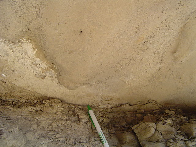 English: A Flute cast, a sedimentary structure in which a river current scours a specific shape into the base of a bed. This view is from below, i.e., from an overlying sand body that filled in (the "cast") the scour. From the Book Cliffs near Helper, Utah. Pen for scale. Flute cast is seen as darker brown shape, broadening and tapering toward the upper right of the picture, which is the paleocurrent direction as well.
