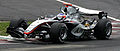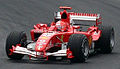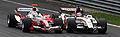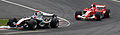 Action on lap 4 of the 2005  Formula One  Canadian Grand Prix,  Kimi Räikkönen leading  Michael Schumacher, with  Jarno Trulli (left) and  Takuma Sato (right) battling.