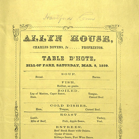 English: Menus from hotels, restaurants, and steamboats in the 1850s and 60s. The name CHARLES DEVENS, Jr, Proprietor, is prominently displayed at the top of this menu.