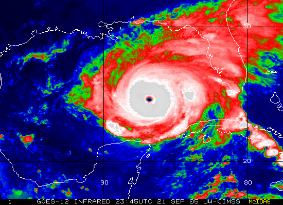 Pseudo-colour IRF image of Rita from NASA GOES-12; processing by University of Wisconsin, Cooperative Institute for Meteorological Satellite Studies; used by implicit permission. |