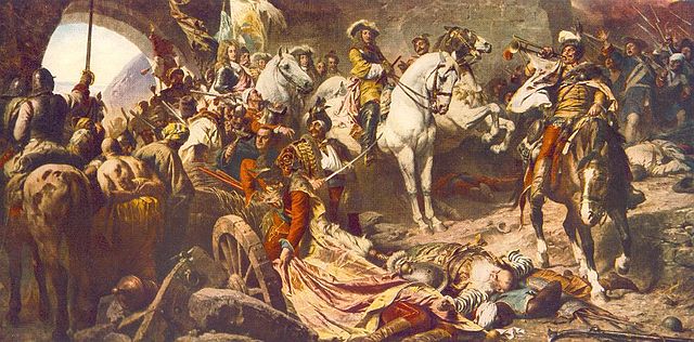 Magyar: A lovon Lotaringiai Károly herceg, az előtérben sebesült karral, karddal a kezében Petneházy Dávid hajdúkapitány. Forr. MEK Magyar Nemzeti Galéria, Budapest