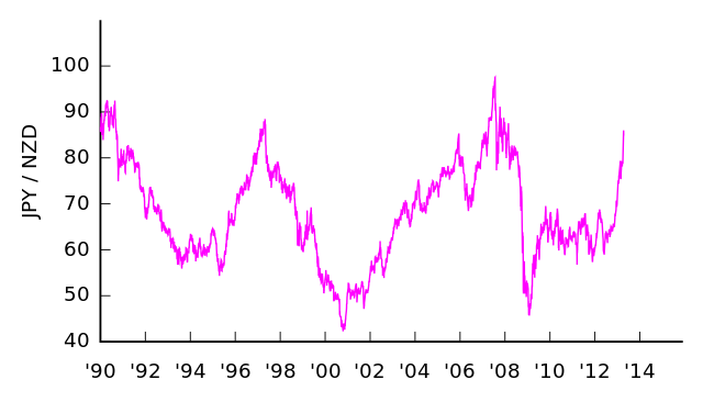English: Graph showing New Zealand Dollar and Japanese yen exchange rate from January, 1990.