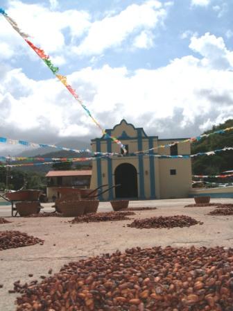 English: Cacao drying square in front of church, Plaza de Secado, Chuao, Venezuela.