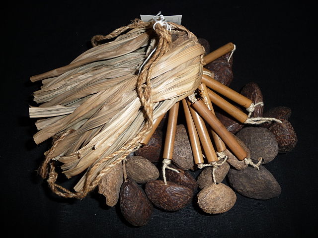 English: This rattle is made of leaves, seeds and coconut shell. It is tied around a dancer’s ankle and makes a sound when the dancer moves.