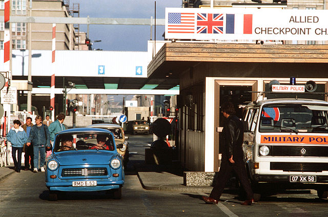 East Germans drive their vehicles through Checkpoint Charlie as they take advantage of relaxed travel restrictions to visit West Germany.