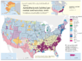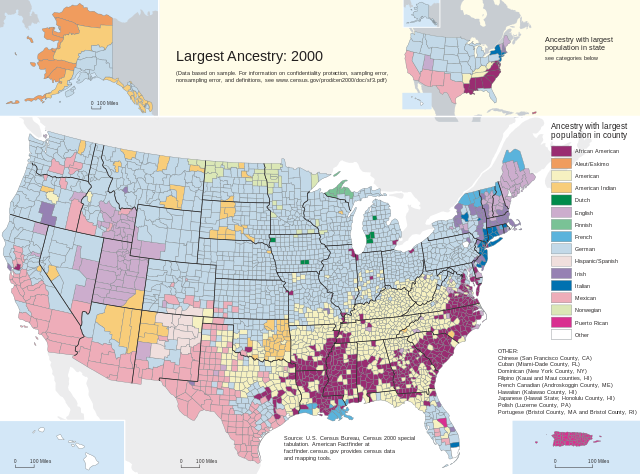 A chart of the top reported ancestries in the US, as provided by the 2000 census. Shaded colour represents the largest number of respondents (a plurality) from sample. Areas with the largest "American" ancestry populations were mostly settled by Germans, English, French, Welsh, Scottish and Irish.