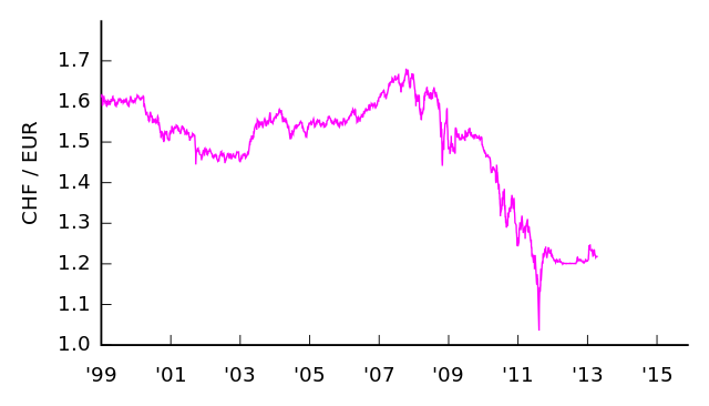 English: Graph showing Swiss franc and Euro exchange rate from January, 1999.
