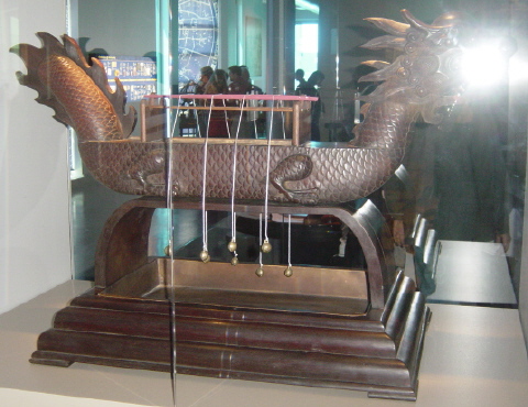 This ancient Chinese dragon shaped device was constructed with a sequence of bells tied to a horizontally mounted burning incense. When the burning incense burnt and broke the threads, the bells fell down at preset interval to give an alarm.