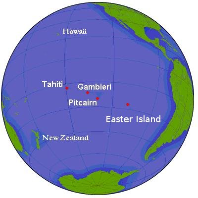 Simple map of globe, seen from area of  Pitcairn Island and  Tahiti. Ocean waters along continental shelves are shaded in darker hue. Parallels of latitude are at 20-degree intervals. Labels are in English.