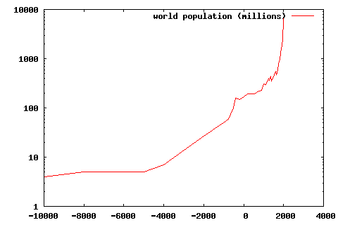 English: log-y scale of the world population curve. Just the same data that appears in  World population and in the  image:Population curve.svg