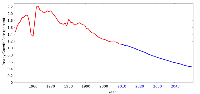 A chart of changes in world population growth rate from 1950–2010 (red) and predicted changes in world population growth rate from 2010–2050 (blue).
