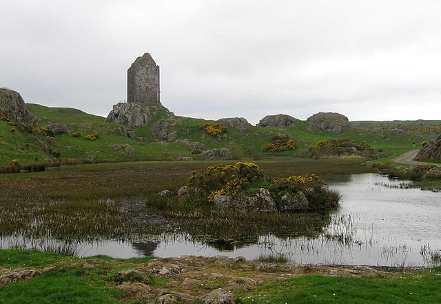 Smailholm Tower, Scotland, view from the east across the lochan from near Sandyknowe Farm, childhood home of  Walter Scott. |