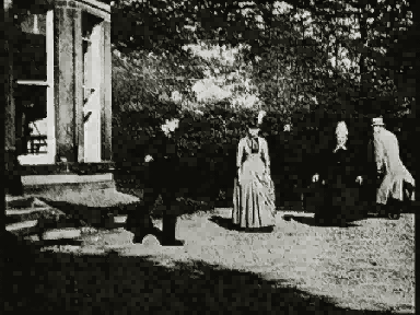 A screenshot of Roundhay Garden Scene by the Frenchman Louis Le Prince. The world's first film, shot on 14 October 1888 at Oakwood Grange in Roundhay, Leeds, West Yorkshire, England. The home of Joseph and Sarah Whitley, the in-laws of Louis Le Prince. Note that Sarah (shown second from right) died on 24 October 1888, only 10 days after being filmed in the movie.