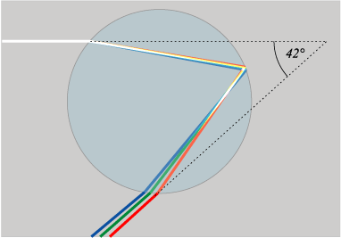 White light separates into different colours (wavelengths) on entering the raindrop, as red light is refracted by a lesser angle than blue light. On leaving the raindrop, the red rays have turned through a smaller angle than the blue rays, producing a rainbow.