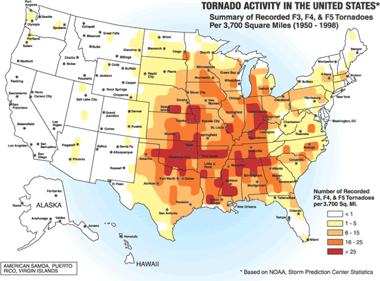 English: A map of the frequency of F3 and greater intensity tornadoes by area. The darker colors highlight the area typically known as Tornado Alley.