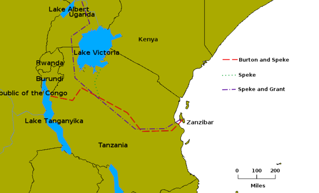 Routes taken by expeditions of Burton and Speke and Grant and Speke. Burton and Speke explored from the east coast as far as Tanganyika and then returned. Speke took a side journey to Lake Victoria on the return journey. Speke and Grant journeyed from the east coast and via Lake Victoria returned up the river Nile. Note that the country names and boundaries are the modern ones not the names of the time and the boundaries would, obviously, be uncertain at that point. Image produced by Richard G. Clegg using freely available map data and software. |