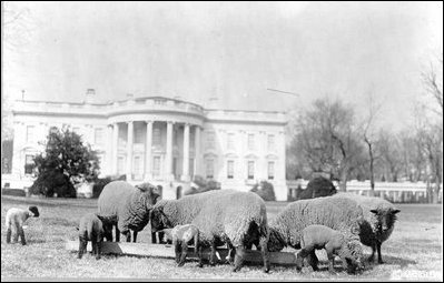 Sheeponthesouthlawn-398h.jpg Sheep graze on the White House lawn during Woodrow Wilson's tenure. They were kept as part of the WWI war effort, "Conservation was the by word around the White House; eight sheep were soon gracing the lawns . . . many thousands of dollars were raised for the Red Cross through the auctioning of wool. Two pounds of wool were sold for each state when the sheep were fleeced of almost a hundred pounds of raw wool." - White House Maid and Seamstress Lillian Rogers Parks (My Thirty Years Backstairs at the White House, Fleet, 1961)
