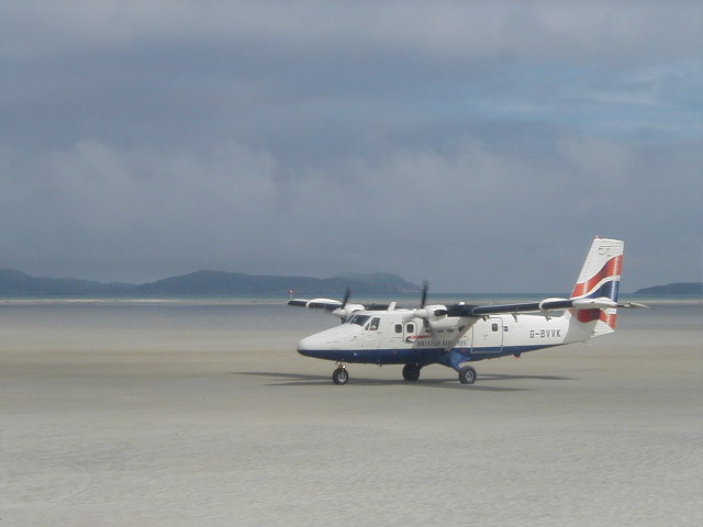 English: A Loganair Twin Otter (G-BVVK) (in BA colours) lands at Barra Airport - the only airport in the world where the arrival of scheduled flights varies with the tide as planes land on the beach.