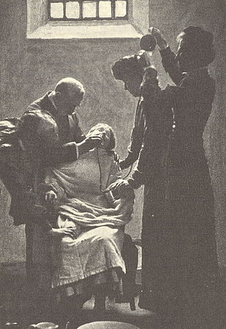English: A suffragetteit may be emmeline pankhurst on a hunger strike being forcibly fed with a nasal tube