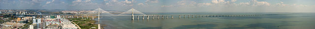Panorama view of the Vasco da Gama bridge in Lisbon, Portugal. This image is composed of 11 photographs taken by hand from the top of the EU tower (also named after Vasco da Gama) at the Expo'98 park in Lisbon. |