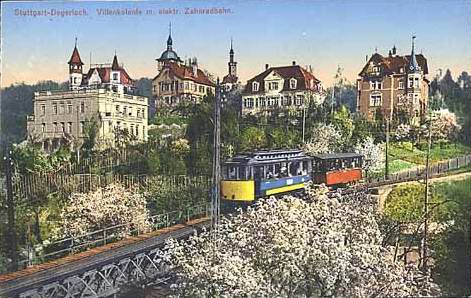 Stuttgart-Degerloch, Postkarte 1917 (Beschriftung: "Stuttgart-Degerloch, Villenkolonie m. elektr. Zahnradbahn")