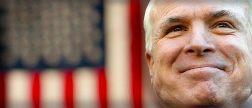 English: McCain displaying his patriotic countenance with the flattering background of a United States flag.