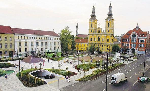 Miskolc, the new Heroes' Square with the Minorite church and the Földes High School