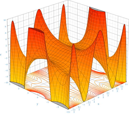 Graph of z = Re(1-(x+I*y)^2/2! + (x+I*y)^4/4! - (x+I*y)^6/6! +(x+I*y)^8/8!), selfmade with MuPad |