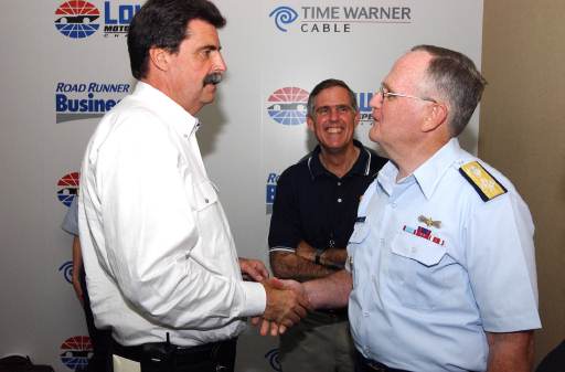 Description: CHARLOTTE, N.C. (May 28, 2005) Adm. Thomas Collins presents NASCAR President Mike Helton a commandant coin prior to the Carquest 300 NASCAR race at Lowe's Motor Speedway. Slug 050528-C-4512L-141 (FR)
