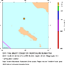 Locations of initial earthquake and all aftershocks measuring greater than 4.0 from 26 December 2004 to 10 January 2005. The site of the original quake is marked by the large star in the lower right square of the grid.