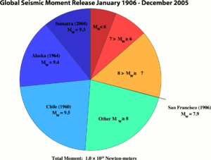 A pie chart comparing the seismic moment release for the largest earthquakes from 1906 to 2005 compared to all other earthquakes for the same period