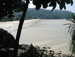 Maximum recession of tsunami waters at Kata Noi Beach, Thailand, before the third, and strongest, tsunami wave (sea visible in the right corner, the beach is at the extreme left), 10:25 am local time.