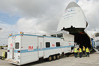 A U.S. mobile air traffic control tower is moved to Haiti by a Russian transport plane
