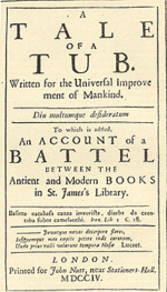 A Tale of a Tub was the first major work written by Jonathan Swift, composed between 1694 and 1697 and published in 1704. It is probably his most difficult satire, and possibly his most masterly. The Tale is a prose parody which is divided into sections of " digression" and a "tale" of three brothers, each representing one of the main branches of Christianity.