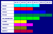 This chart shows that not all fish, shellfish, or the insects that they eat can tolerate the same amount of acid; for example, frogs can tolerate water that is more acidic (i.e., has a lower pH) than trout.