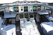 Airbus used similar cockpit layout, procedures and handling characteristics to those of other Airbus aircraft, to reduce crew training costs. Accordingly, the A380 features an improved glass cockpit, and fly-by-wire flight controls linked to side-sticks. The improved cockpit displays feature eight 15-by-20 cm (6-by-8-inch) liquid crystal displays, all of which are physically identical and interchangeable. These comprise two Primary Flight Displays, two navigation displays, one engine parameter display, one system display and two Multi-Function Displays. These MFDs are new with the A380, and provide an easy-to-use interface to the flight management system—replacing three multifunction control and display units. They include QWERTY keyboards and trackballs, interfacing with a graphical " point-and-click" display navigation system.