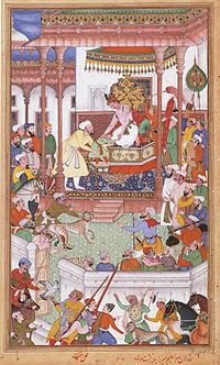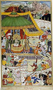The court of young Akbar, age 13, showing his first imperial act: the arrest of an unruly courtier, who was once a favorite of Akbar's father. Illustration from a manuscript of the Akbarnama