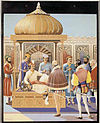 Abu'l-Fazl ibn Mubarak presenting Akbarnama to Akbar, Mughal miniature