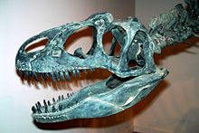 Allosaurus was a large bipedal predator. Its skull was large and equipped with dozens of large, sharp teeth. It averaged 8.5 m (28 ft) in length, though fragmentary remains suggest it could have reached over 12 m (39 ft). Relative to the large and powerful hindlimbs, its three-fingered forelimbs were small, and the body was balanced by a long, heavy tail. It is classified as an allosaurid, a type of carnosaurian theropod dinosaur. The genus has a complicated taxonomy, and includes an uncertain number of valid species, the best known of which is A. fragilis. The bulk of Allosaurus remains have come from North America's Morrison Formation, with material also known from Portugal and possibly Tanzania. It was known for over half of the 20th century as Antrodemus, but study of the copious remains from the Cleveland-Lloyd Dinosaur Quarry brought the name Allosaurus back to prominence, and established it as one of the best-known dinosaurs.