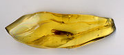 Insect trapped in amber. The amber piece is 10 mm (0.4 inches) long. In the enlarged picture, the insect's antennae are easily seen.